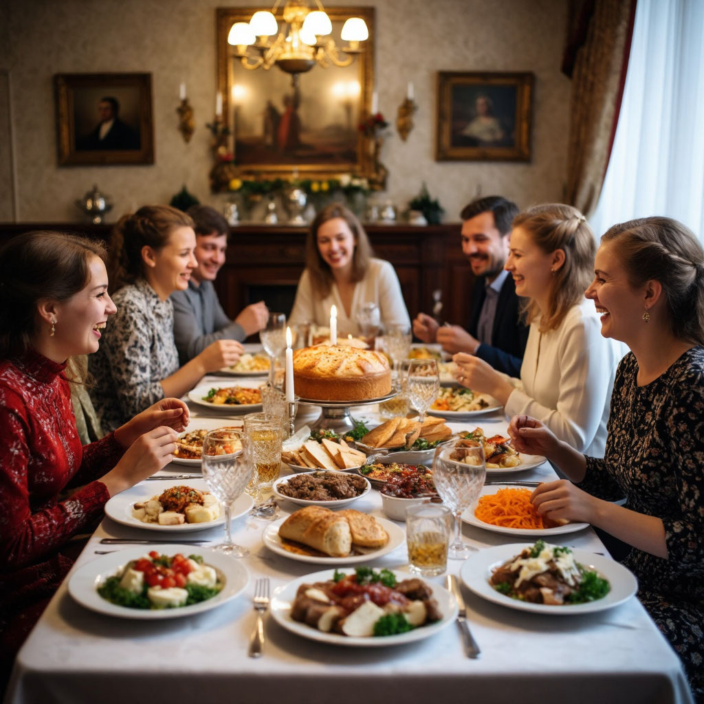 Русское застолье подчиняется строгому порядку, который отражает уважение к гостям и общую гармонию. Начинается всё с хлеба и соли, подаваемых главой семьи, что подчеркивает единство собравшихся. Затем идут холодные закуски: студень, икра и маринады, а следом — пироги, которые присутствуют на столе, как символ изобилия.