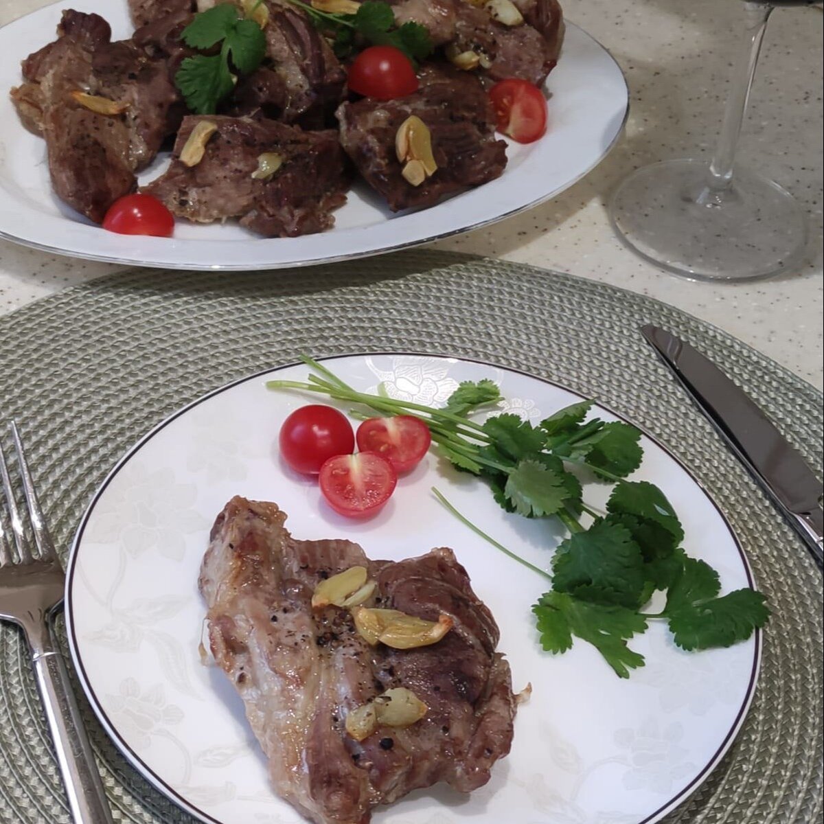 Сначала подготовить все ингредиенты.Свинину нарезать на стейки толщиной около 1 см – отбивать не нужно.В ступке измельчить черный перец горошком: так специя раскроет свой аромат. Если ступки нет, можно использовать готовый молотый перец.Одну половину пергаментной бумаги смазать подсолнечным маслом.На противень выложить стейки, посолить и поперчить по вкусу.Чеснок постучать плоской стороной ножа для раскрытия аромата и выложить по 2-3 зубчика на каждый кусок свинины. По желанию, чеснока можно добавить больше.Смазываем маслом вторую половину пергамента и накрываем стейки.Запечатываем края, чтобы сок оставался внутри, и помещаем в предварительно разогретую до 200°C духовку на 40-50 минут.Готовое мясо подаем, украсив овощами и зеленью.Советы к рецепту