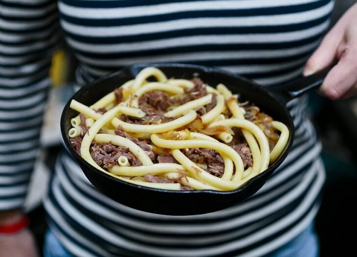 Солдатский вариант макарон по-флотски готовят на ходу, поэтому фарш заменить тушенкой — это настоящая находка. В условиях похода такое решение действительно удобно и быстро.