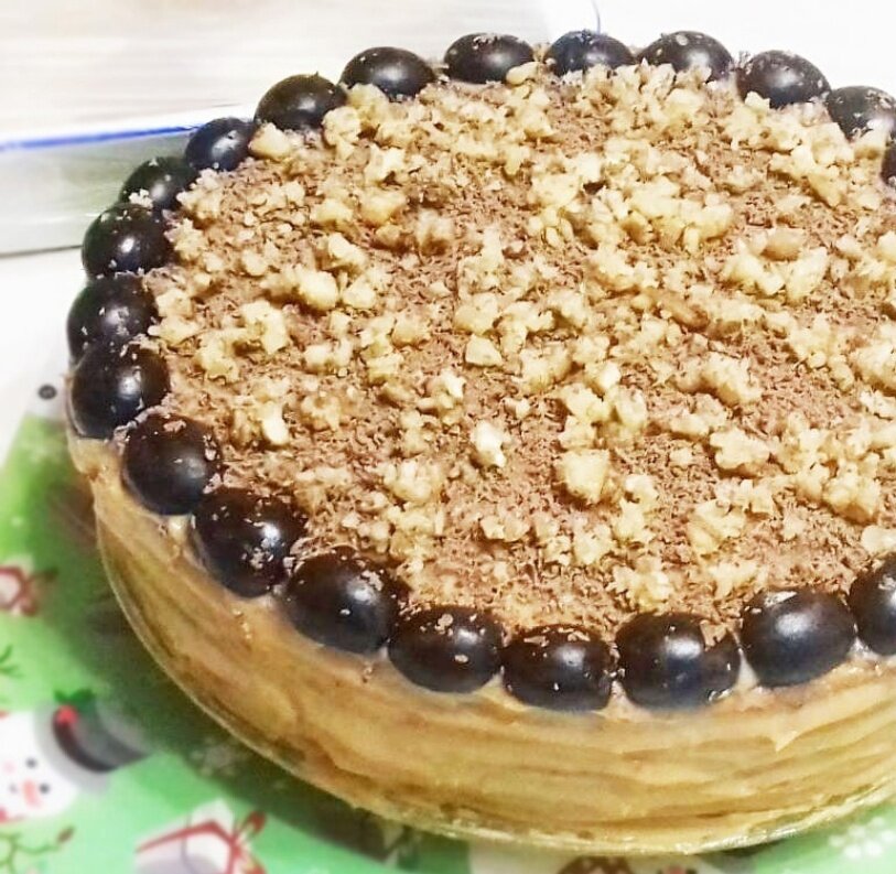 Каждый корж промазывают кремом и аккуратно складывают один на другой. Верхний фрагмент торта можно украсить по собственному желанию: орехами, шоколадом или даже ягодами. Чтобы торт пропитался кремом, его оставляют в комнате, а затем устанавливают в холодильник на 8-10 часов — так он станет еще вкуснее.