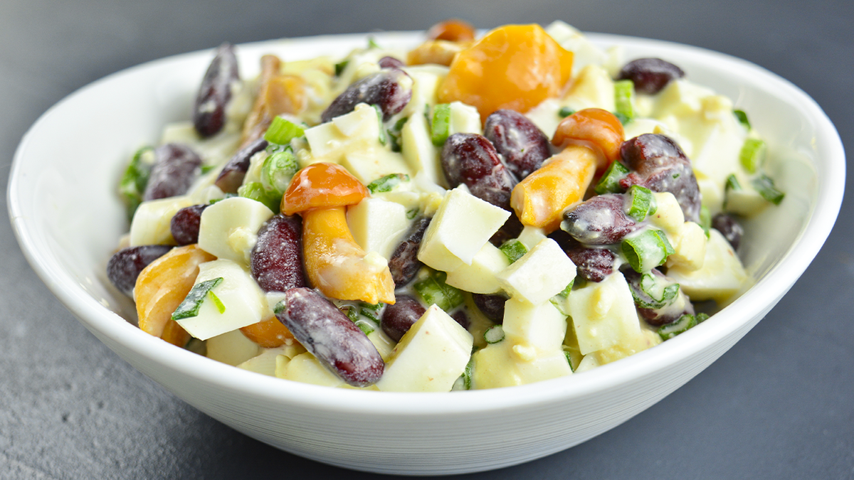 Приготовление салата займет всего 5 минут, а для этого понадобятся всего три основных ингредиента: консервированная фасоль, маринованные грибы и вареные яйца. Фасоль обязательно должна быть в собственном соку, чтобы не загромождать блюдо лишней влагой.