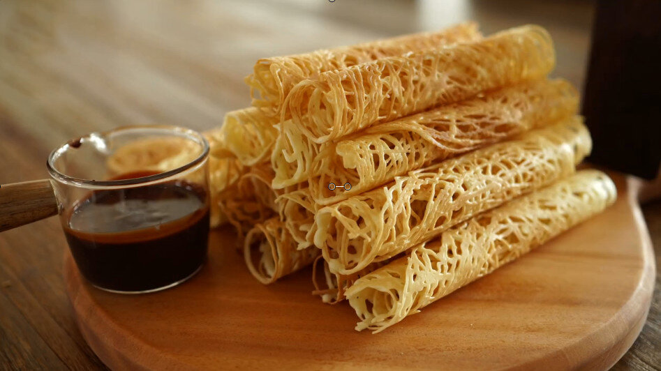 Разогрейте сковороду и из кондитерского мешка формируйте узоры, выливая тесто в виде паутинки. Обжаривайте с одной стороны до золотистой корочки, затем аккуратно сверните в рулетик прямо на сковороде. Он должен быть хрустящим и аппетитным.