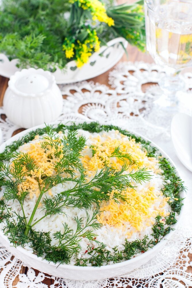 Салат "Мимоза" готов к подаче! Он станет отличным дополнением к праздничному столу и обязательно порадует всех гостей. Приятного аппетита!
