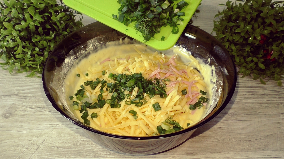 Затем займитесь начинкой: натрите сыр, мелко нарежьте помидор и колбасу, добавьте зелень. Все ингредиенты следует смешать в одной ёмкости.