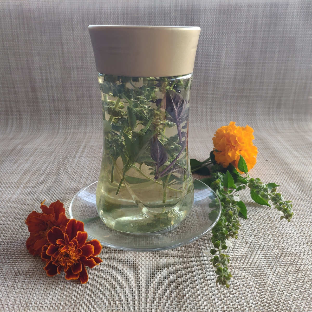 Этот год оказался особенно удачным для базилика, в том числе лимонного сорта. Цветоносы лимонно-мятного базилика отличаются мощным ароматом, и именно их мы возьмём в основу нашего масла, добавив к ним несколько листочков фиолетового базилика. Для этого рецепта подойдёт любое растительное масло, но выбранное подсолнечное рафинированное будет идеальным решением.