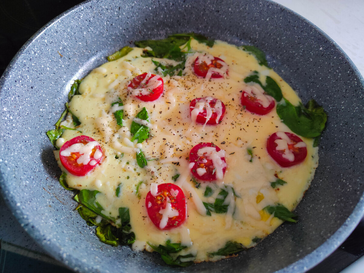 Завтрак: Начали утро с ароматной фриттаты, в которой соединился свежий шпинат и помидоры черри — шпинат был выращен на даче. К этому готовила тосты с плавленным сыром, которые остались после того, как дети купили хлеб для сэндвичей.