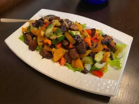Несмотря на то, что гости прибыли на час раньше, что добавило волнение в процесс, кулинарный опыт оказался на высоте. Обжарив мясо и подготовив овощи, автор рецепта смешал все ингредиенты в одной большой тарелке. В результате получился салат, который быстро завоевал симпатии друзей благодаря сочетанию и мяса, и овощей. А добавленный соус стал настоящим маст-хэвом для этого блюда.