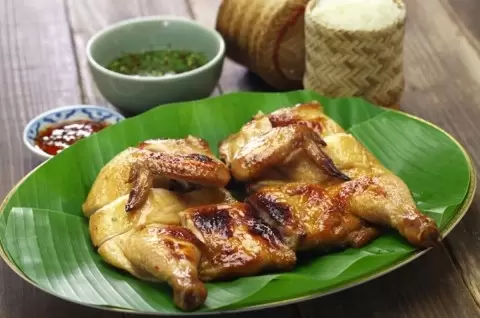 Если используется целый цыпленок, его следует разрезать на части. Замочить в растворе соли на 1–2 часа. Обжарить лук с чесноком до мягкости, добавить карри-пасту и специи. Слегка взбить белок и смешать с маринадом, затем замариновать цыпленка. Запекать около 30 минут и подавать с кисло-сладким соусом и кешью.