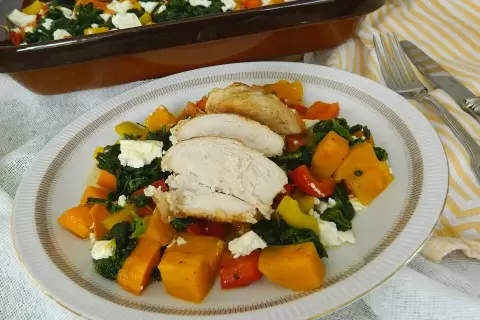 Тем временем, духовку можно заранее разогреть до 200 градусов. Как только это будет сделано, курицу с бататом помещают в духовку, а сами переходят к подготовке остальных ингредиентов. Сладкий перец нарезается кубиками такого же размера, как и батат, а фету – на небольшие кусочки размером около 1-1,5 см. Если используется свежий шпинат, его стоит бланшировать в кипящей воде на минуту, а затем добавить к перцу и сыру. Замороженный шпинат можно просто добавить в смесь.