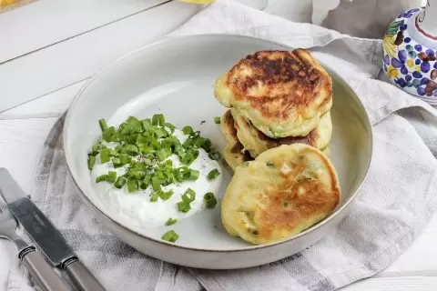По мере приготовления оладушек, не забудьте приготовить соус: смешайте сметану с оставшимся зеленым луком и добавьте соль по вкусу. Подавайте оладьи горячими с ароматным сметанным соусом.