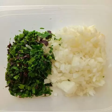 Для начала требуется подготовить общую смесь фарша. В мялкий кубик нарезают две головки лука и тщательно шинкуют крупный пучок зелени. В состав зелени могут входить петрушка, укроп, кинза и базилик, что придаст блюдам особый аромат и свежесть.
