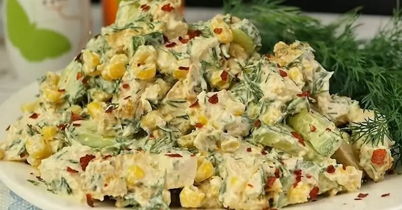 Когда курица подготовлена, нарезать ее на полоски или кубики, добавить нарезанные огурцы, зелень и кукурузу. Не забудьте приправить смесь перцем и итальянскими травами. Готовый салат можно украсить хлопьями чили для остроты и эффектности.