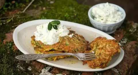 Если оладьи из кабачков с традиционной сметаной уже надоели, попробуйте подать их с пикантным творожным кремом. Для его приготовления используйте творог, зелень и немного чеснока – это добавит блюду необычный вкус. Наверняка ваш утренний стол станет более ярким и интересным!