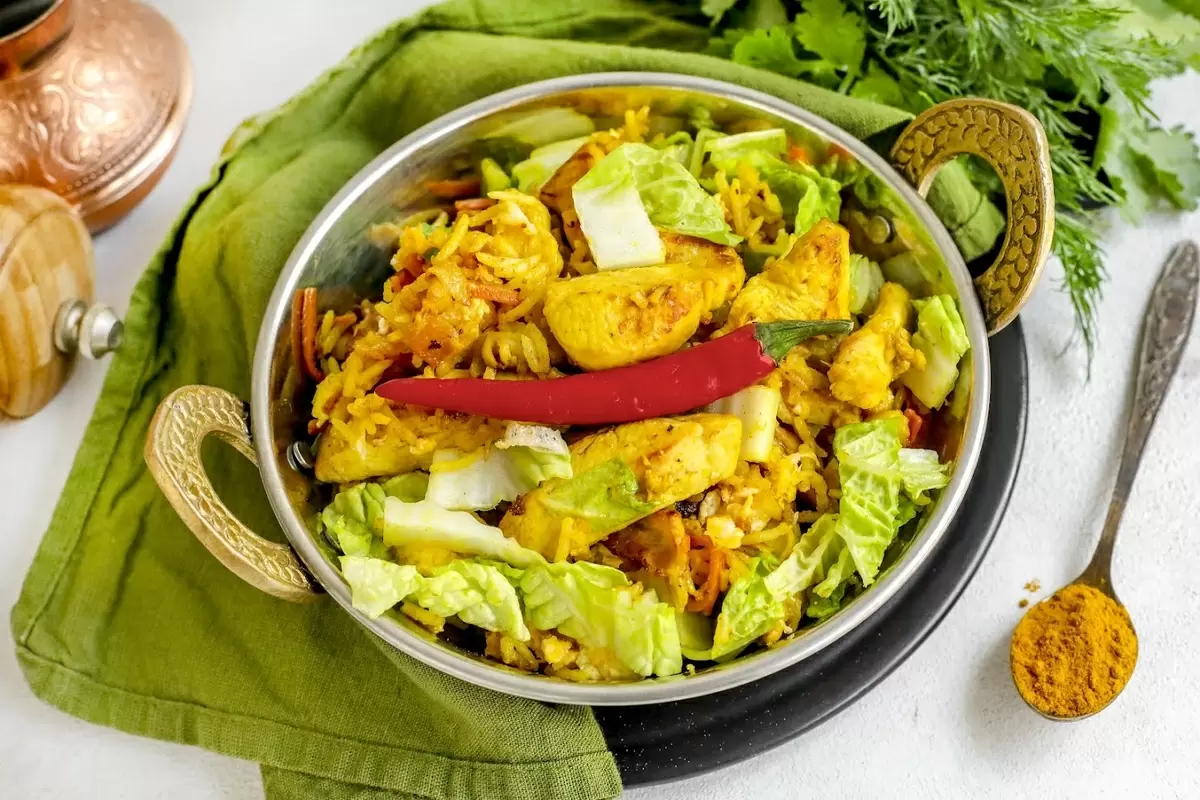 Шаг 1: Рис жасмин не требует предварительного промывания. Вскипятить 1,5 литра воды, добавить соль и засыпать рис. Варить примерно 10-12 минут, периодически помешивая. Готовый рис откинуть на дуршлаг и промыть теплой водой для удаления лишней клейкости. Пока рис варится, очистить и нарезать соломкой морковь, а бекон и имбирь мелко порезать. Пекинскую капусту также нарезать соломкой. В раскаленной сковороде с растительным маслом обжарить куриное филе в течение 3-4 минут, потом добавить чеснок, имбирь и бекон. Готовить еще 1-2 минуты, затем всыпать специи и морковь. Обжаривать около 3-4 минут.