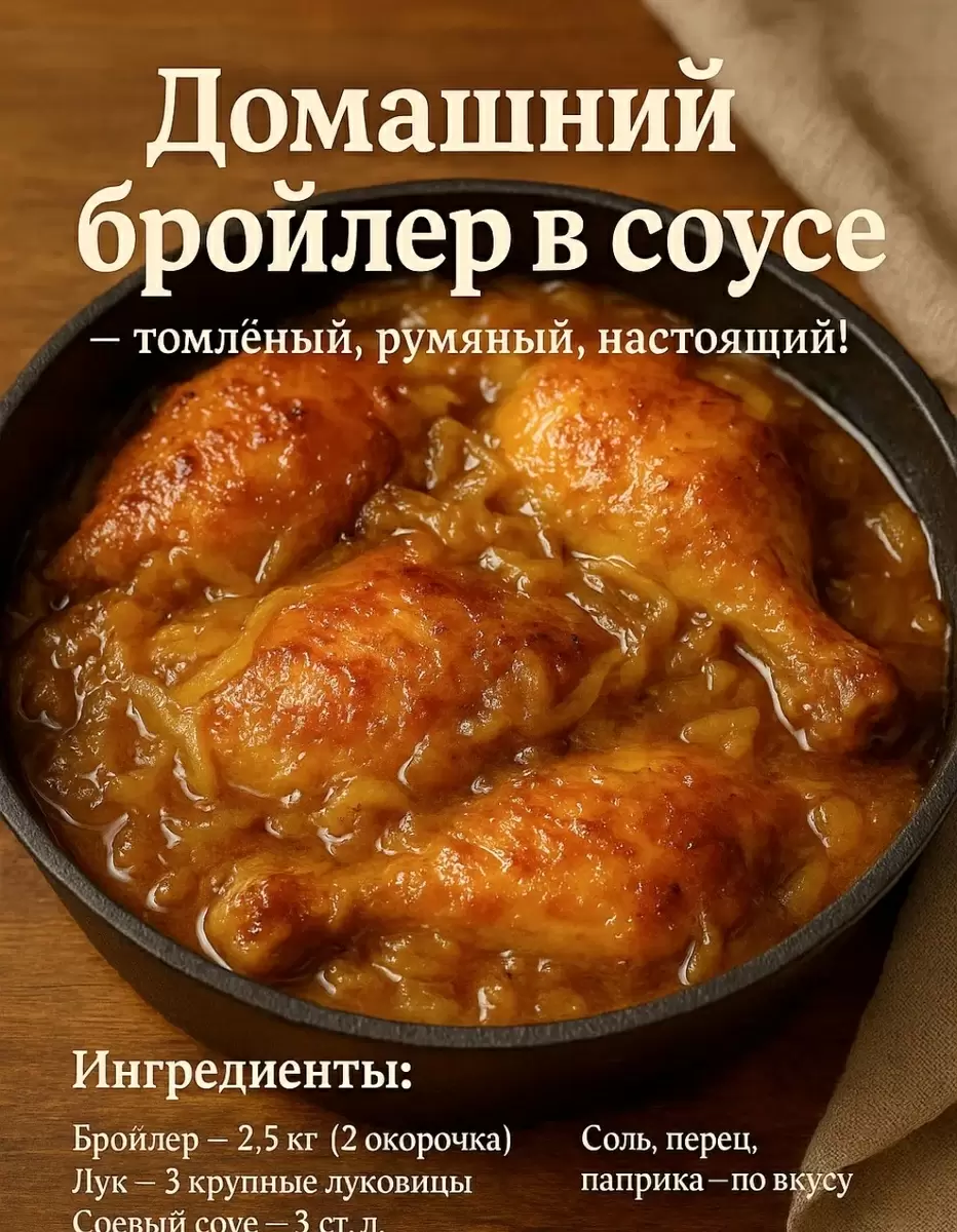 Вечером на столе появится бройлер, приготовленный в ароматной луковой подливке. Для этого блюда используются максимально взрослые бройлеры, достигшие веса 4-6 килограммов. Готовить их не менее четырех месяцев — именно тогда мясо становится по-настоящему насыщенным и вкусным, идеальным для разнообразных кулинарных шедевров.