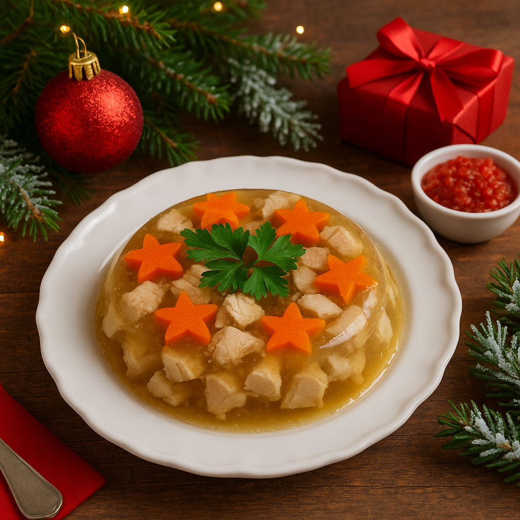 Так рождается ощущение времени: привычка, теплота и простое наслаждение тем, что родное и близкое. Заливное напоминает, что праздник начинается задолго до хлопков курантов, и продолжается в кухонной тишине после.»