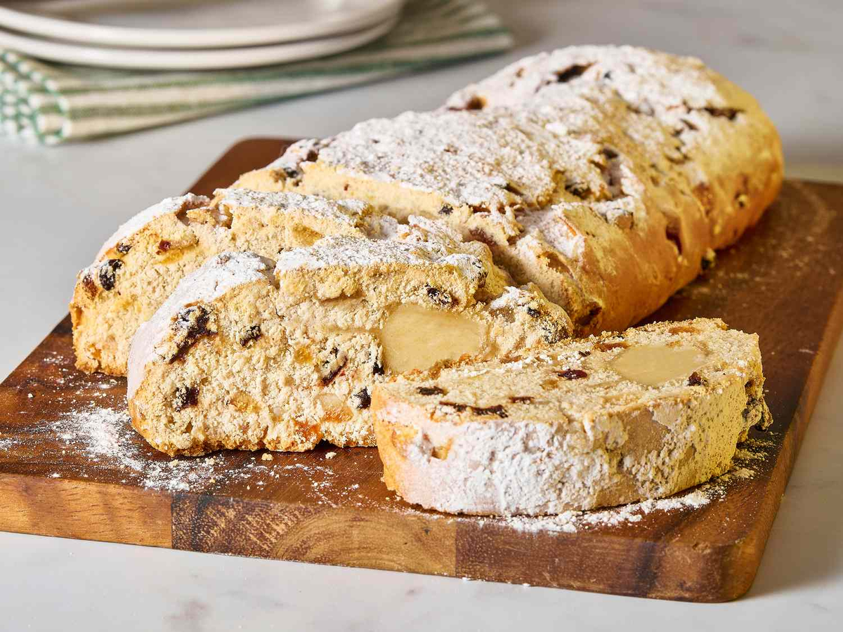 4. Выпечка: Выровненные штоллены положите на противень и дайте постоять 30 минут. Выпекайте в разогретой до 160°С духовке в течение 40–50 минут, накрыв фольгой, если верх начнет темнеть. По завершении немедленно смажьте маслом и посыпьте сахарной пудрой.
