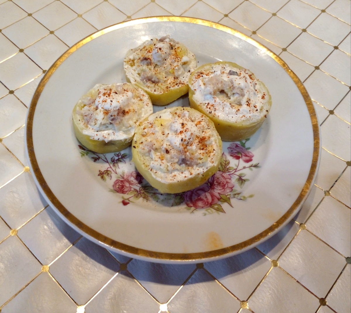 Картофель очищается от кожуры. Срезав верхнюю часть, следует сделать так называемое "донышко", чтобы картофель устойчиво стоял на тарелке.