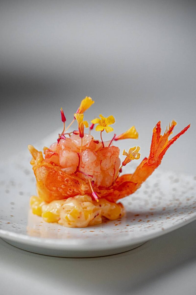 Соус, созданный из сезонных фруктов, добавляет яркие нотки свежести, а чуть-чуть остроты от чили придаёт блюду интригующий вкус. Яичные желтки раскрываются волнением бархатистой глубины, заставляя вас возвращаться к каждому кусочку снова и снова. Подача, превращающая еду в ритуал: возьмите креветку за хвост, насладитесь тартаром, а остатки хвостика помогут вам ловко собрать соус, чтобы не пропадала ни капля.