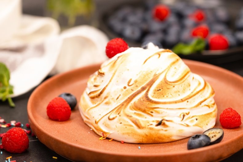 В глубокой миске соедините 2 яйца и сахар, взбейте с помощью миксера до создания однородной светлой массы.Затем добавьте муку, разрыхлитель, растопленное сливочное масло и тщательно перемешайте до гладкой консистенции.Выстелите противень пергаментом, вылейте в него тесто, равномерно распределив его. Выпекайте при температуре 180°С около 12-15 минут, до появления золотистого цвета.Готовый бисквит следует извлечь из противня и оставить остывать на пергаменте, затем удалить его.Подготовьте креманку, накрыв ее пленкой, и заполните наполовину подтаявшим пломбиром. Приложите крышку и утрамбуйте, затем поставьте в морозильник на час.Отделите белки от желтков двух яиц, добавьте соль и начните взбивать на низких оборотах, постепенно увеличивая скорость. Постепенно введите сахарную пудру и продолжайте взбивать до образования устойчивых пиков.Остывший бисквит вырежьте по размеру креманки, а затем аккуратно выложите замороженное мороженое сверху, убрав пленку.Обильно покройте поверхность меренгой и обожгите с помощью горелки до золотистого цвета.Украсив десерт свежими ягодами, подайте его к столу.Сейчас — самое время насладиться этой экстравагантной сладостью!