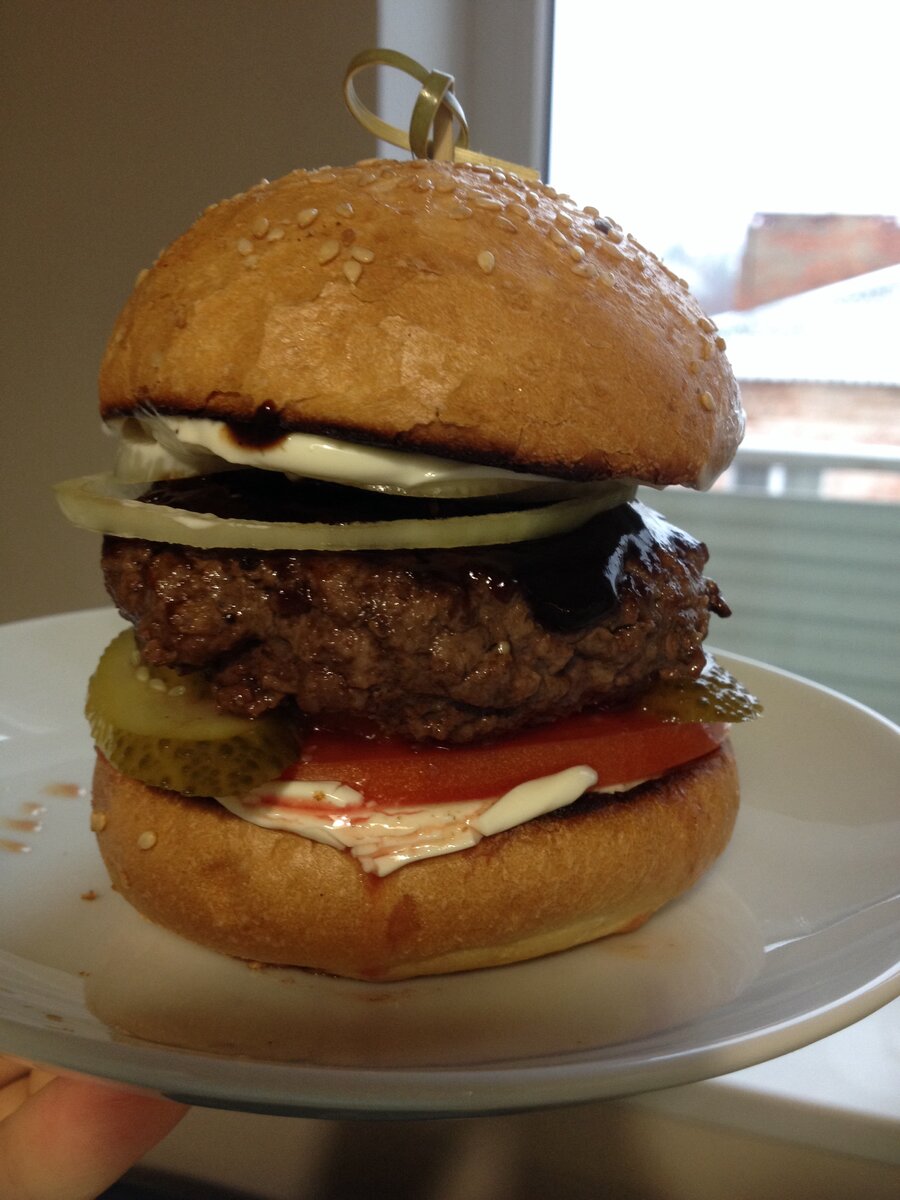 Пропустите говяжью вырезку и репчатый лук через мясорубку до получения однородного фарша.Добавьте 20 мл воды, соль, перец и куриное яйцо. Тщательно перемешайте, отбейте фарш, собрав его в комок и сбросив на разделочную доску.Сформируйте два плоских котлета и обжарьте их на подсолнечном масле по 1.5 минуты с каждой стороны. Затем поместите котлеты в духовку, разогретую до 180 градусов, и запекайте в течение 13 минут.Раскатайте булочки пополам и поджарьте их в духовке вместе с котлетами в течение 2 минут.Мелко нарежьте свежие и маринованные огурцы, соедините их с майонезом, вустерширским соусом и TABASCO®.Нарвите салат айсберг и уложите на нижнюю половину булочки, добавьте соус, затем нарезанные колечками помидоры и тонкий красный лук.Сверху положите котлету, накройте второй половиной булочки и подайте к столу.