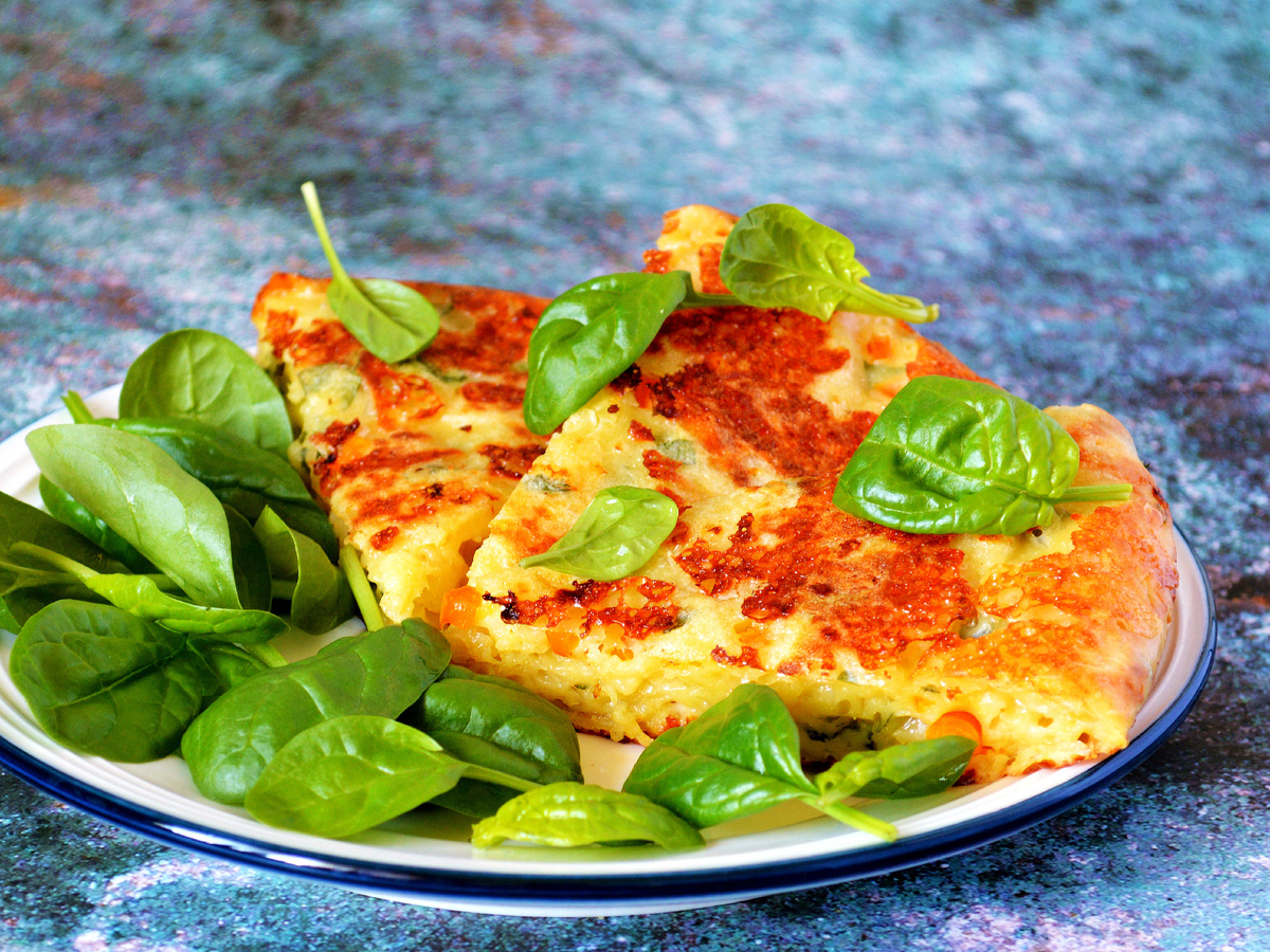 Переходим к приготовлению. Сначала натрите сыр на крупной терке, чтобы его ощущение было на высоте в каждой лепешке. Мелко нарежьте болгарский перец, а шпинат промойте и нарежьте произвольно, но не слишком крупно. В глубокой миске взбейте яйцо с солью, добавьте молоко и тщательно перемешайте до однородности. После этого введите муку и разрыхлитель, тщательно перемешайте — вам нужно получить густое тесто без комочков.