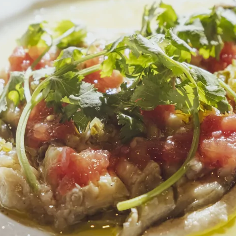 4. На тарелку выкладывается кунжутный соус, затем запеченный баклажан и увенчивается сальсой из помидоров и зелени.