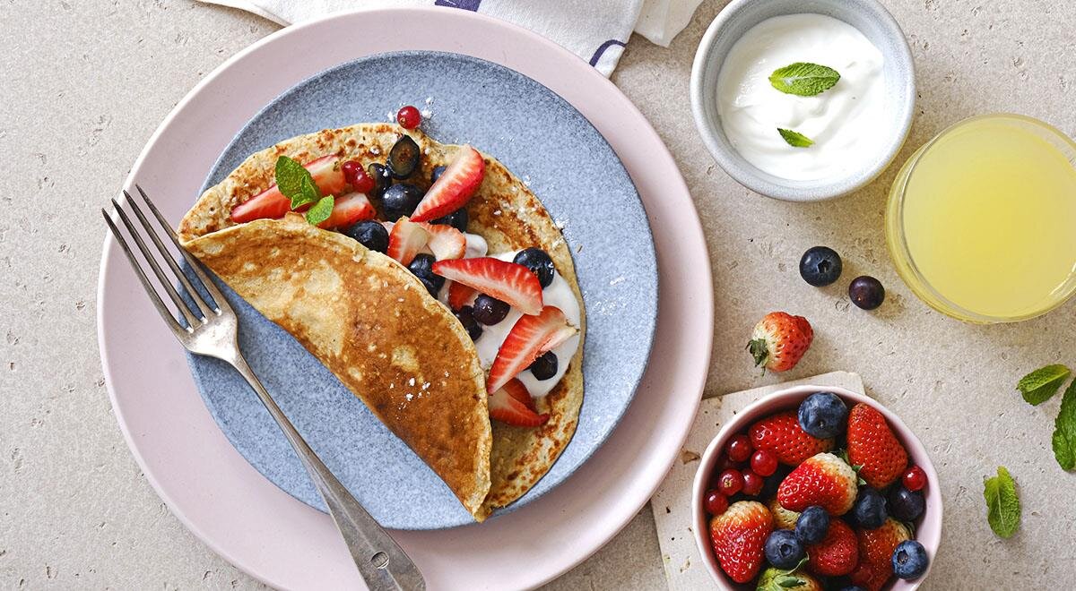 Шаг 3: Переложить готовый овсяноблин на тарелку, украсить ягодами и йогуртом, добавить мяту и подавать немедленно.