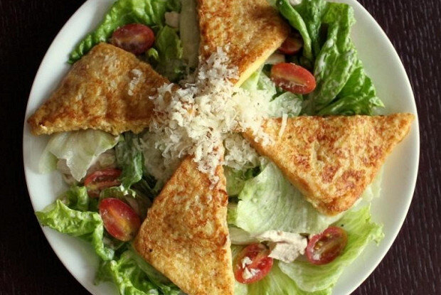 В сковороде разогрейте оставшееся оливковое масло и обжарьте хлеб до золотистой корочки. После этого разрежьте тосты на треугольники и выкладите сверху на салат. Завершите блюдо, посыпав тертым пармезаном.