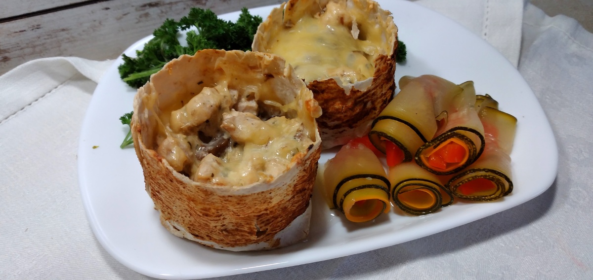 Жюльен – это блюдо, к которому каждый подходит по-своему. Для одних это изысканное лакомство с тщательно приготовленным соусом, для других – простая запеканка, а кто-то воспринимает жюльен как безусловную горячую закуску. Предлагаем вам освежить свои вкусовые ощущения с помощью необычной подачи: жюльен с грибами в съедобных стаканах из лаваша.