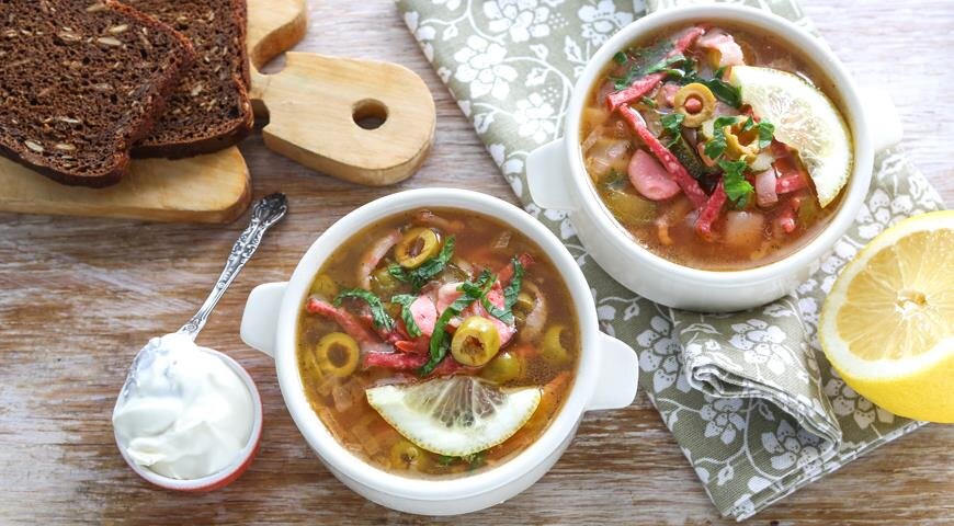 Шаг 6: В почти готовую солянку добавьте маслины и доведите до кипения. Выключите огонь, накройте кастрюлю крышкой и дайте настояться 15 минут. Подавайте в тарелках, добавив ломтик лимона.
