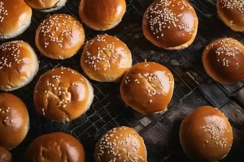 • Перед выпеканием смажьте булочки взбитым яйцом, посыпьте кунжутом и готовьте в предварительно разогретой до 200°C духовке около 15 минут.