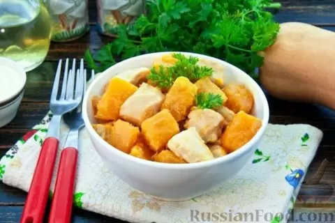 - Курица, тушенная с тыквой и сметаной — простое, питательное и лёгкое в приготовлении блюдо, в котором куриное филе идеально сочетается с тыквой. Сметана и соевый соус добавляют интересный изысканный вкус, который приятно удивит.