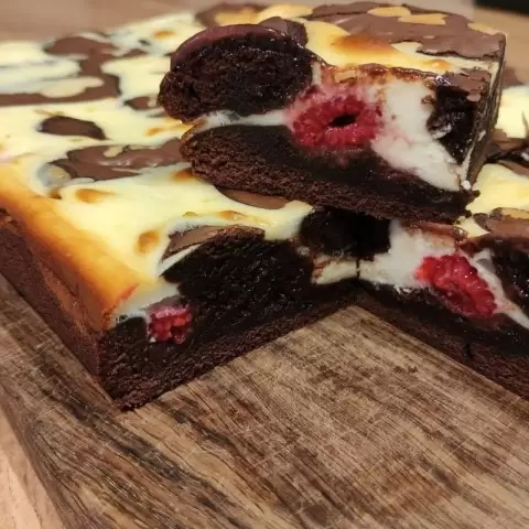 Сначала взбейте яйца с сахаром до получения легкой пены, добавьте растопленное масло и остальные ингредиенты для шоколада. Затем объедините творожный сыр с яйцом и сахаром до однородной массы. Выложите тесто в форму, добавьте ягоды и запекайте при температуре 180°C в течение 25-30 минут. Позвольте десерту остыть перед подачей, чтобы он не крошился.