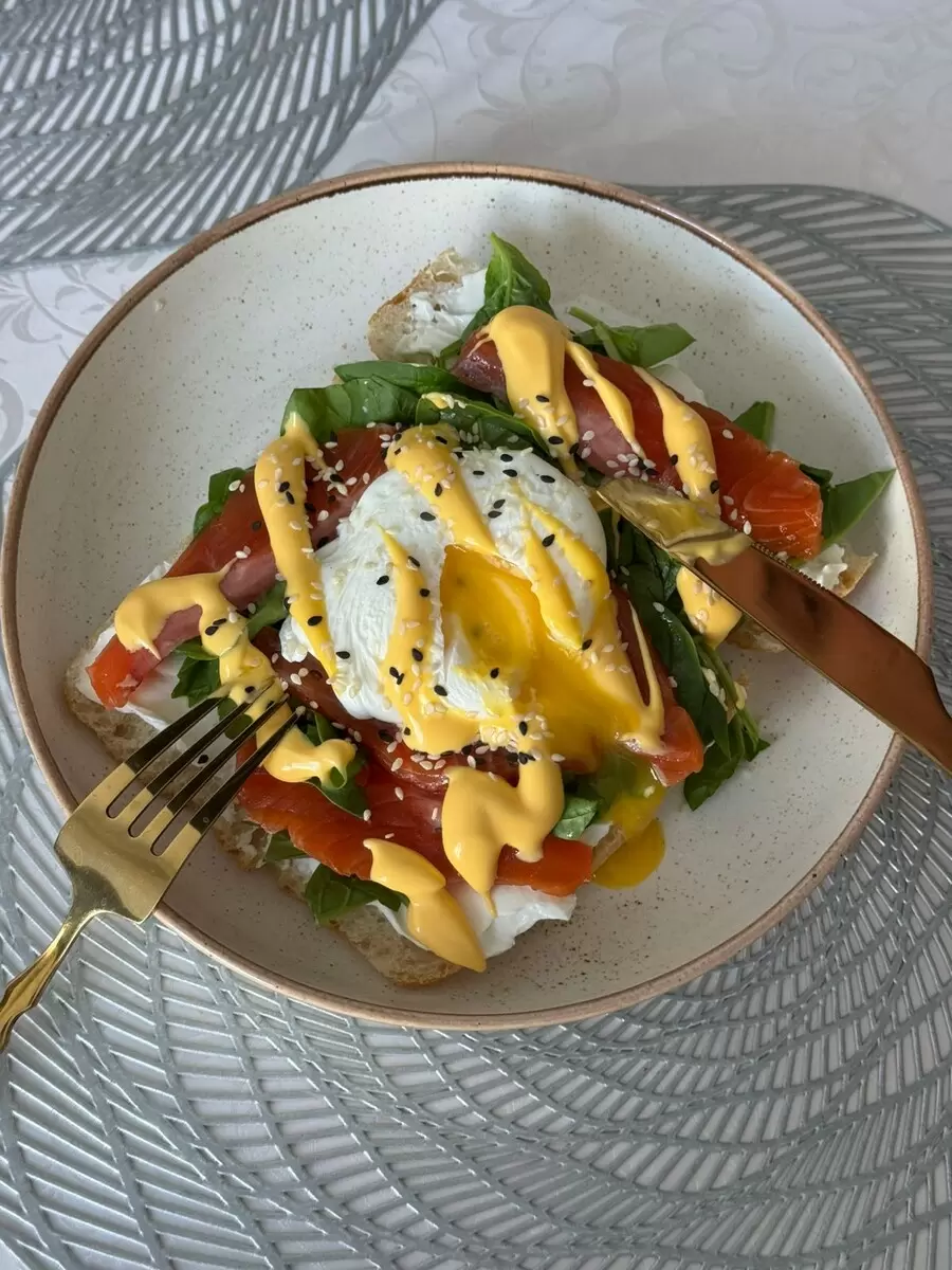 Сборка: на теплую брускетту щедро намажьте творожный сыр, который слегка растает, создавая нежную основу. Затем добавьте шпинат, ломтики форели и аккуратно положите яйцо пашот сверху.