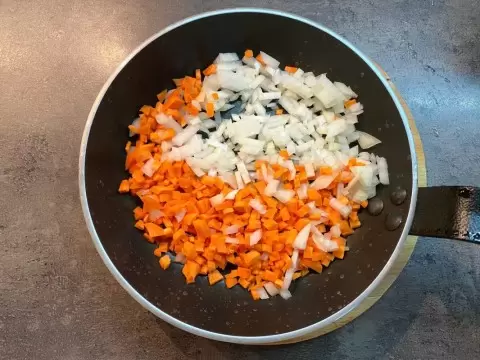 - Лук и морковь следует мелко нарезать и обжарить на разогретой растительной сковороде. Важно постоянно помешивать, чтобы овощи проготовились равномерно и не пригорели.