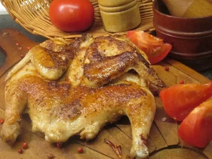 Процесс приготовления начинается с разрезания курицы от гузки до плеча, после чего удаляется шея. Далее курицу необходимо отбить до плоского состояния, лучше всего, накрыв ее пленкой, чтобы избежать разбрызгивания.