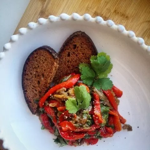 Баклажаны и перцы нужно обмазать оливковым маслом и сделать несколько проколов ножом. Запекайте в разогретой до 180-200 градусов духовке до появления обугленных мест.Сразу после запекания выложите горячие овощи в плотные целлофановые пакеты, выпустив воздух, и оставьте остывать. Этот способ значительно упростит процесс очистки.Через 20-30 минут снимите обугленную кожуру, извлеките семена из перцев и нарежьте овощи на длинные полоски. Мелко нарежьте кинзу и раздавите чеснок, затем тщательно перемешайте все ингредиенты.Заправьте салат оливковым маслом и бальзамическим уксусом, добавьте соль и перец по вкусу, снова все аккуратно перемешайте и дайте настояться.Этот салат особенно хорош на следующий день.Советы по улучшению рецепта