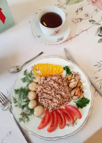 5. Разложить кашу по тарелкам и украсить блюдо маринованными шампиньонами, отварными мидиями, свежими помидорами, сладким перцем, а также зеленью укропа и петрушки.