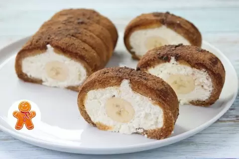 На пропитанное печенье равномерно наносится крем, а впридачу к нему, по центру выкладываются нарезанные бананы. Затем бананы также закрываются слоем крема. При помощи пленки, аккуратно сворачивается рулет. В конце, рулет следует поместить в холодильник на несколько часов, чтобы он окончательно застыл.