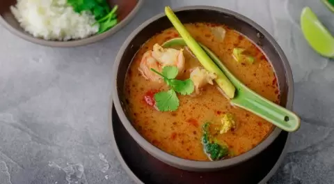 - Ингредиенты: свежие креветки, сибас, лимонграсс, галангал, лайм, рыбный соус и другие необходимые специи.