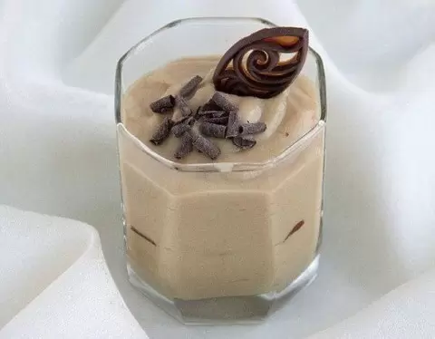 Сборка десерта. Заполните охлажденную креманку наполовину кофейным кремом, добавьте шоколадный круг, затем оставшийся крем. Можно сделать несколько шоколадных прослоек. Чтобы шоколад смог сохранять форму, используйте хорошо охлажденный крем. Украсить десерт можно тертым шоколадом и оставить в холодильнике до подачи.
