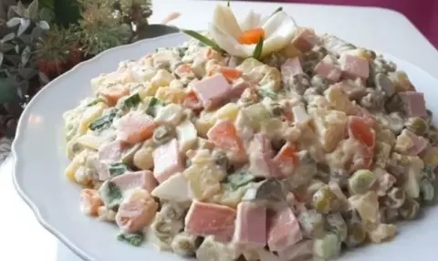 - Для разнообразия можно добавить горсть консервированной кукурузы — она прекрасно сочетается с зеленым горошком и добавляет сладковатую ноту.