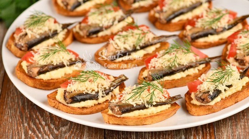 Теперь на остывшие картофельные ломтики равномерно распределяют сырный соус, а сверху аккуратно укладывают шпроты. Чтобы добавить свежести, рядом размещают нарезанный кубиками помидор, предварительно удалив семена и лишнюю влагу. Альтернативно вместо помидоров можно использовать свежий огурец.