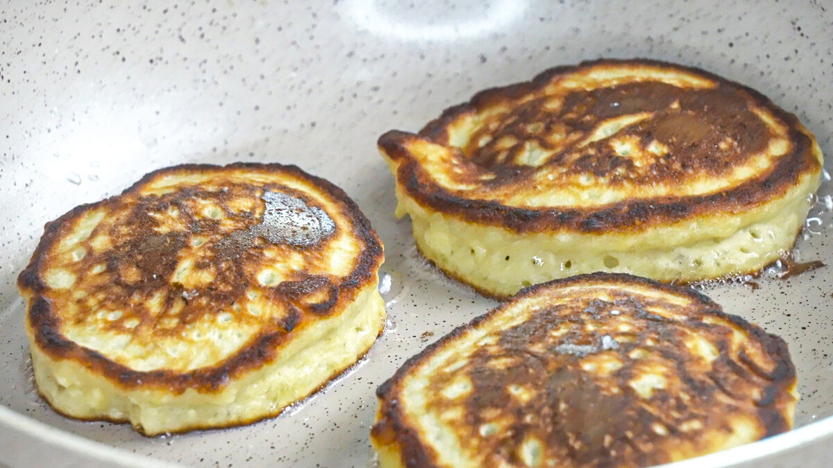 - Обжаривайте оладьи с обеих сторон до золотистой корочки — это займет всего около одной минуты.