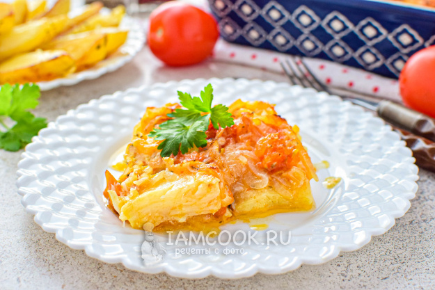 Пока рыба пропитывается, займитесь овощами. Нарежьте 2 средние луковицы полукольцами и обжарьте на 20 г растительного масла в течение 3-4 минут, пока лук не станет прозрачным. Затем добавьте 2 нарезанных помидора и тушите смесь еще 4-5 минут, пока овощи не размягчатся. Лук прибавит сладости, а помидоры — кислинки, отлично уравновешивая жирность майонеза.