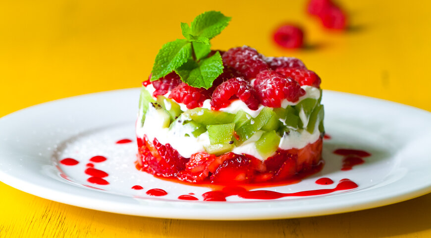 Для начала, в сотейнике соедините малину и сахар, доведите до кипения на среднем огне, помешивая.После закипания, оставьте немного остывать, а затем протрите через сито, чтобы избавиться от семян, и охладите соус до комнатной температуры.В другом миксере взбейте сливки до крепких пиков.Аккуратно объедините взбитые сливки с маскарпоне, добавив ванилин для аромата.Клубнику нарежьте на 6–8 частей, крупные ягоды малины разрежьте пополам, а киви очистите и нарежьте небольшими кубиками.В специальное кольцо положите слоями фрукты и крем, затем аккуратно снимите кольцо и полейте десерт малиновым соусом. Если кольца под рукой нет, его можно сделать из фольги или просто аккуратно сложить слои без него.Приятного аппетита!