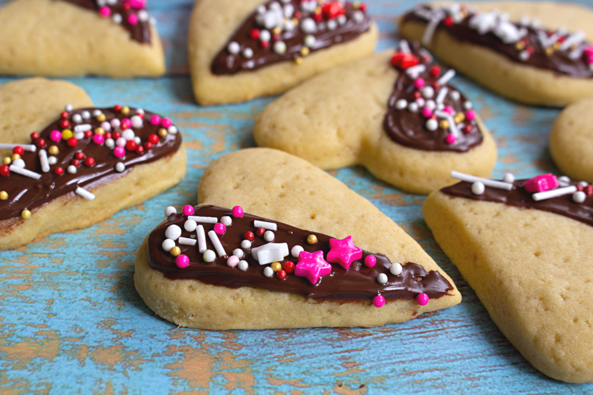 6. Дайте готовым печеньям немного остыть, прежде чем украшать их. Для декора растопите шоколад, нанесите его на одну половинку печенья и присыпьте посыпкой.